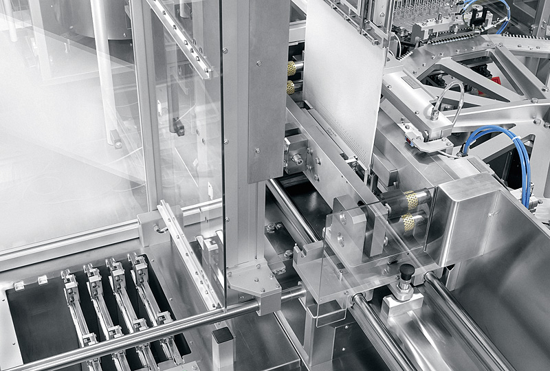 Hier kontrolliert eine Kamera die Plastikröhrchen auf Beschädigungen, bevor sie mit den Caps bestückt werden. Mittels Rezeptvorwahl kann die Füllmenge der Dispenser von zehn bis 16 Caps variieren. Ein leichtes Rütteln des Röhrchens sorgt nach dem Einsetzen dafür, dass die Caps gut ineinander gleiten. Eine mechanische Füllhöhenkontrolle überwacht den Bestückungserfolg. Auf das letzte Cap wird ein Gewicht aufgesetzt und dessen Präsenz wiederum mechanisch bestätigt. Der Stopper verschließt den ImmunoCAPTM Test Dispenser am hinteren Ende. Als letzter Montageschritt werden die über einen Wendelförderer an die Anlage herangeführten Kappen aufgesetzt. Greifer legen alle Gutteile in Lagen von zehn Dispensern in Faltschachteln ab.