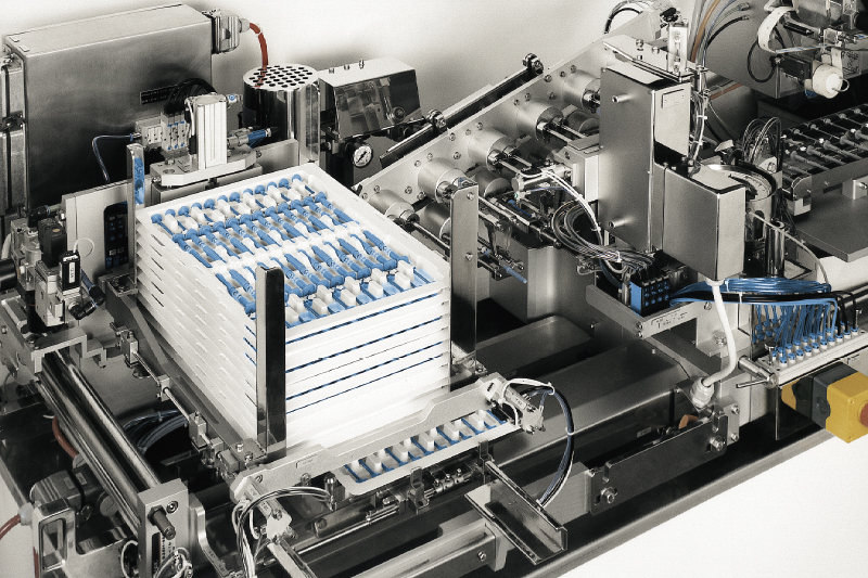 Die Maschine öffnet automatisch die vormontiert angelieferten Spritzen, prüft Länge und Anwesenheit des Depots, setzt das empfindliche wirkstoffhaltige Implantat ein, schließt die Spritzen und transportiert sie zur Entnahmestelle. 20 hochwertige Spritzen pro Minute werden auf diese Weise hergestellt – ein gewaltiger Fortschritt im Vergleich zur bis dahin rein manuellen Herstellung.