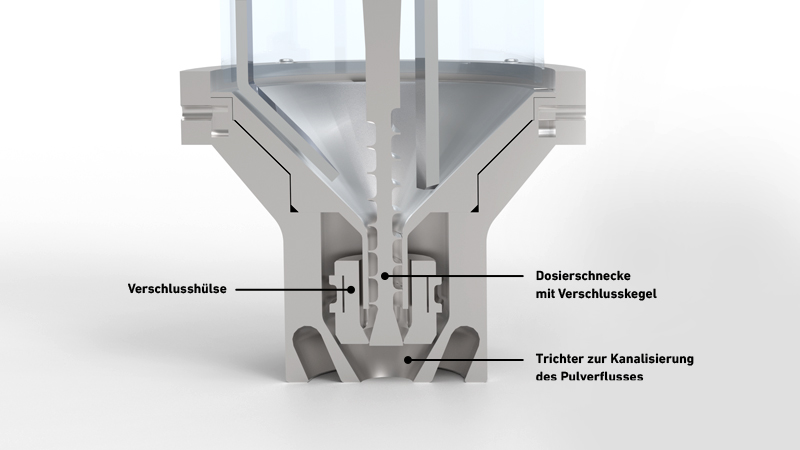 Um das Pulver in Bewegung zu halten, gibt es im Behälter eine spezielle Pulverfluidisierung mittels Rührer. Die Antriebe dieses Rührers und der Schnecke sind voneinander unabhängig ausgeführt, damit das Pulver während Dosierstopps besser kontrollierbar ist. Doch sind solche Stopps ausgerechnet bei sehr gut fließendem Pulver eine echte Herausforderung für so manchen Schneckendosierer; das Pulver rieselt möglicherweise weiter, was zu Verschmutzungen und ungenauen Dosierergebnissen führt.